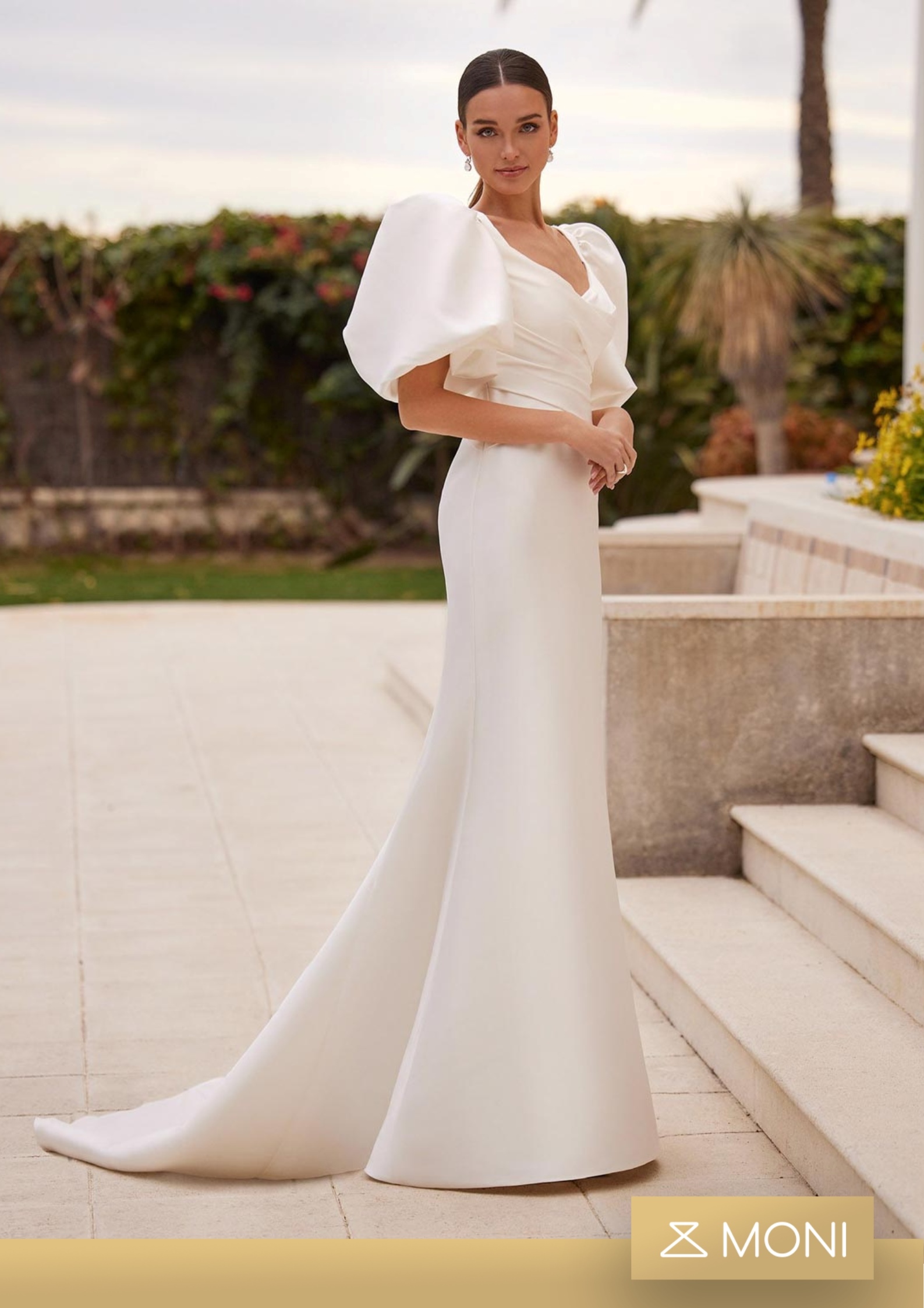 Svadobné šaty Bertha sú jednoduché saténové šaty, ktoré pôsobia pompézne vďaka veľkej sukni a nariaseným rukávom.